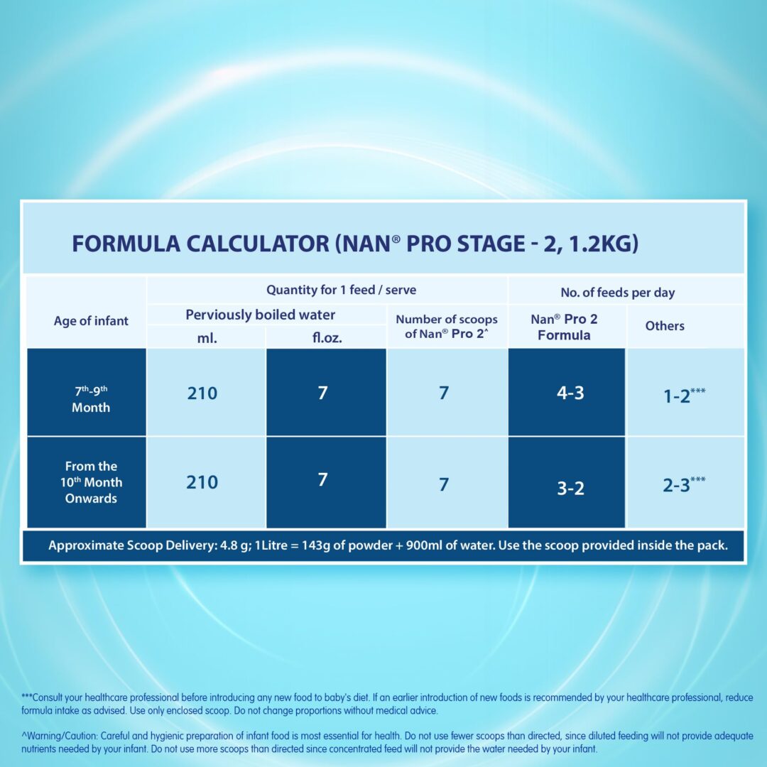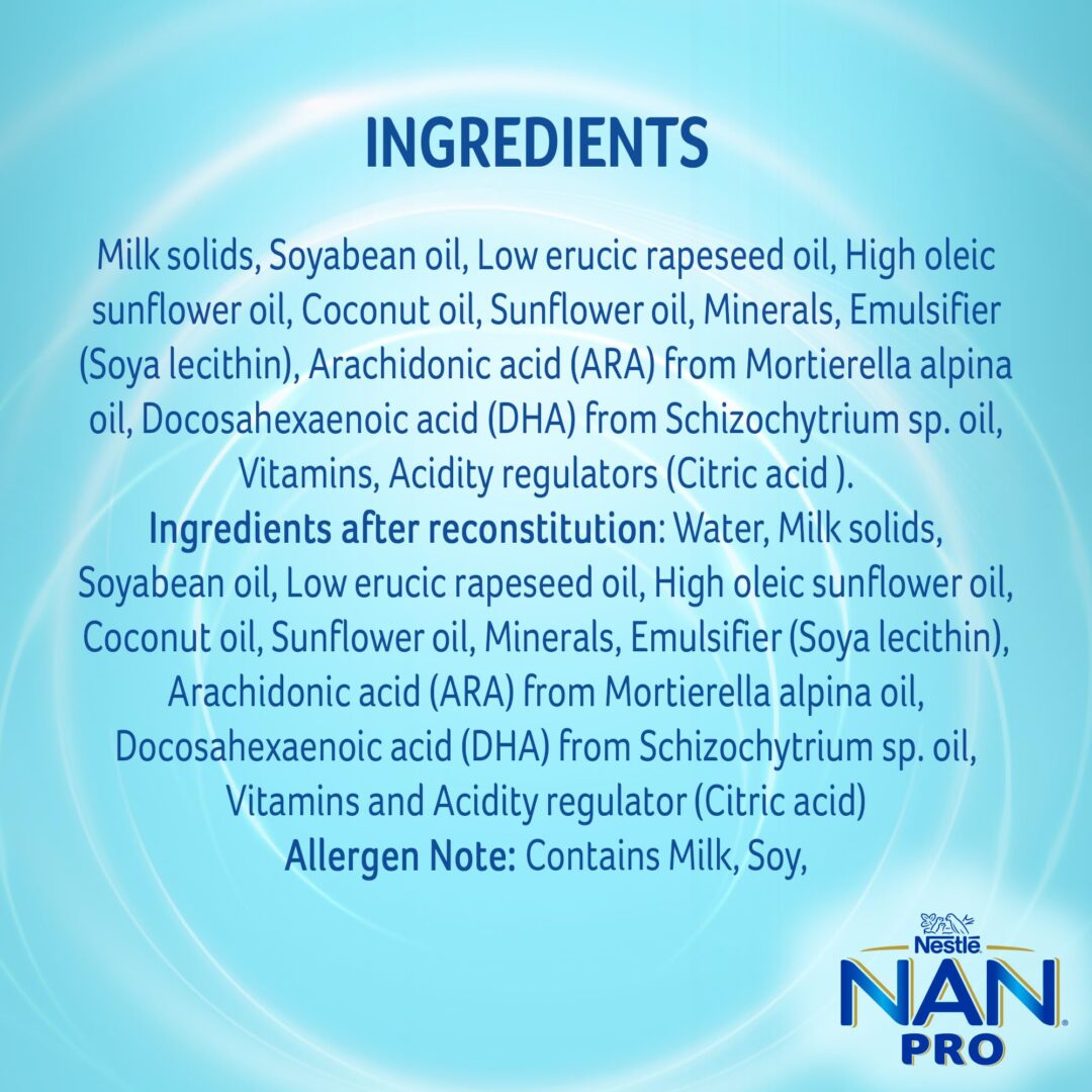Details: Nestlé has 155 years of expertise in Infant Nutrition. Nestlé develops infant nutrition products backed by evolving science and research. Innovation has been at the heart of Nestlé since its beginning. Nestlé NAN PRO 2 is a spray dried follow-up formula with DHA, ARA, Vitamins and Minerals for babies after 6 months when they are not breastfed. NAN PRO 2 contains DHA, which helps support normal brain development. It contains Iron, which helps support normal cognitive development. This follow-up formula also contains Vitamin A, C, & Zinc, which contribute to normal immune system function; and Calcium & Vitamin D to support normal bone growth and development. Important Notice: Mother’s milk is best for your baby. Please consult your healthcare professional for guidance.